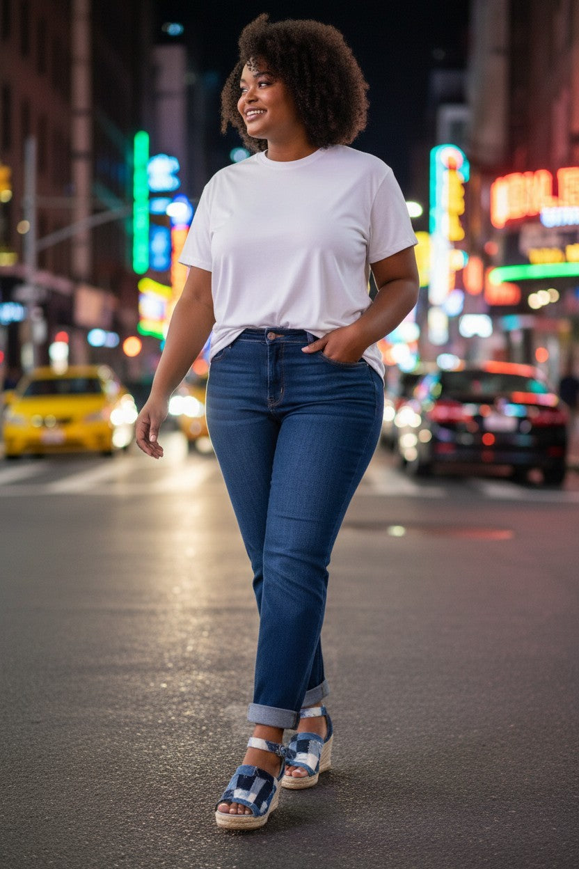 BOHO RUGGED DENIM SANDAL, WIDE HEEL 5 INCHES TALL